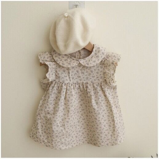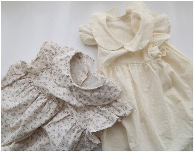 丸襟のネックラインと、肩のシャーリングフリルがかわいいワンピース。